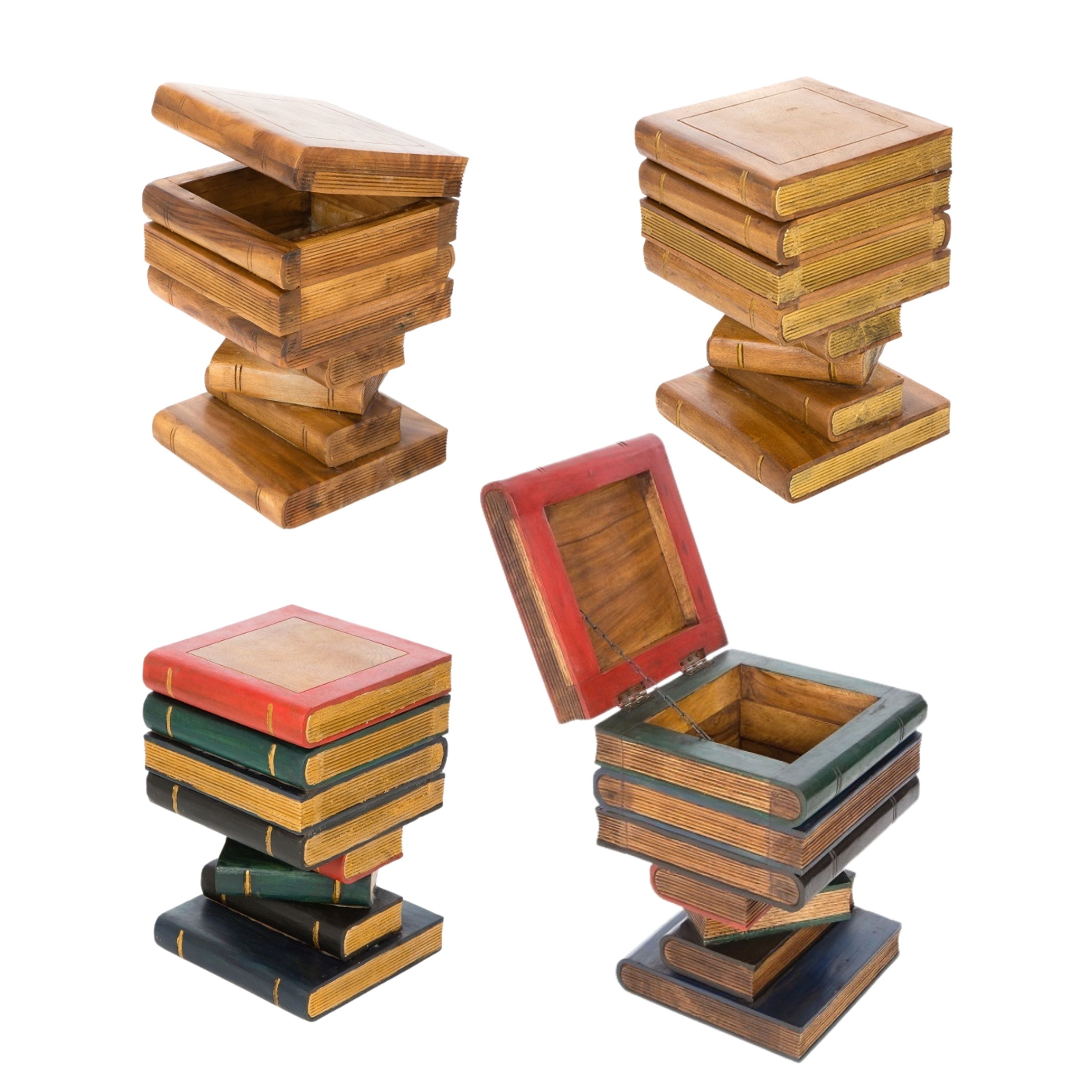 Charmingly reminiscent of an assortment of literary masterpieces, this fabulous book stack storage table is beautifully handmade and finished with a plain brown wax the book leaves are painted gold . Skillfully hand crafted from sustainable monkey pod wood, it is protected with a layer of clear wax to help prevent damage and enable it to be easily cleaned with a damp cloth.